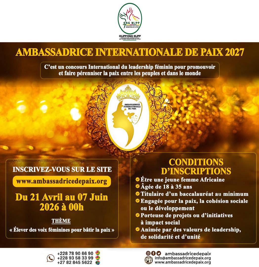 C’est désormais officiel. Le concours international AMBASSADRICE DE PAIX 2027 ouvre ses candidatures du 21 avril au 07 Juin 2026, marquant le coup d’envoi de sa 3ᵉ édition, placée sous le thème « Élever des voix féminines pour bâtir la paix » et signe de l’engagement, du leadership féminin et de la consolidation de la paix à l’échelle du continent africain.