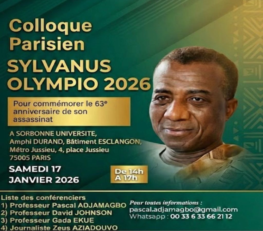 À l’occasion du 63ᵉ anniversaire de l’assassinat de Sylvanus Olympio, premier président du Togo et figure fondatrice de la Nation, Sorbonne Université accueillera, le 17 janvier 2026, un colloque international diffusé en ligne. Portée par le professeur Pascal Kossivi Adjamagbo, cette rencontre académique réunira chercheurs et acteurs des médias autour de l’héritage politique, panafricain et historique de Sylvanus Olympio, dans une volonté affirmée de revisiter l’histoire togolaise à la lumière de la vérité, de la mémoire et du débat universitaire. Lisez plutôt !